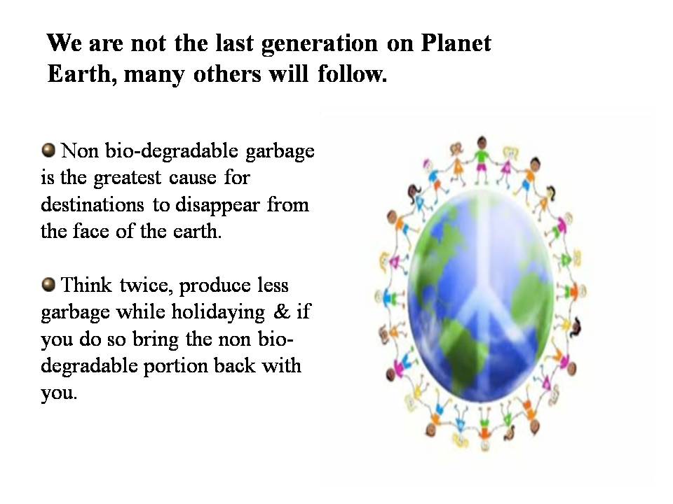 We at L'orient Travels have embarked on a campaign of sensitizing students, tourism academies, local institutes and other social media wherein we encourage the tourist/traveler going on day visits, picnics and overnight trips to bring his/her non bio garbage back home. Strange as it may sound our suggestion is to bring a trash bag for leftovers to be kept at a convenient place or carried along during treks, hikes and forest rides. The garbage accumulated during the stay needs to be put in the trash bag for leftovers to be kept at a convenient place or carried along during treks, hikes and forest rides. The garbage accumulated during the stay needs to be put in the trash bag and brought back. It is estimated each visitor generates about 500 grams of non bio waste for each day of stay. This practice is most suitable when visiting ecologically fragile areas which do not have sufficient waste disposal and garbage facilities. Once this method is followed the carrying capacity of the destination automatically increases because tourist leave nothing but footprints behind - be it a secluded beach, virgin forest, winding hills or monument sites located in secluded areas and lofty forts.